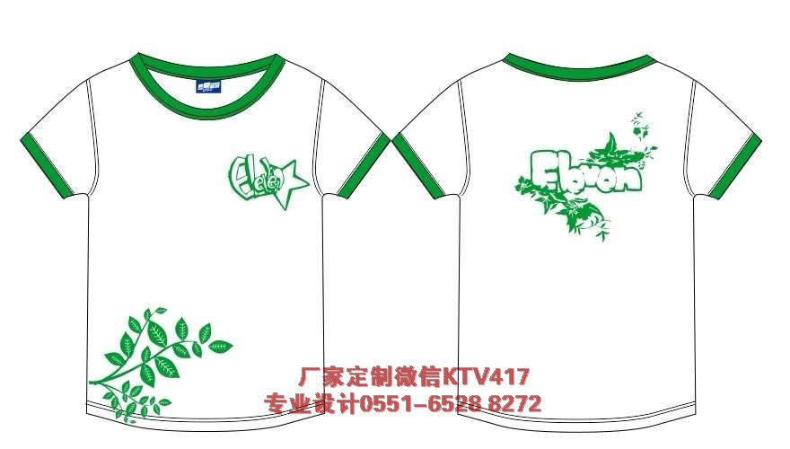 壹班班衫图案,采用的是绿色镶边文化衫,正面是绿色的图案,后面是花。